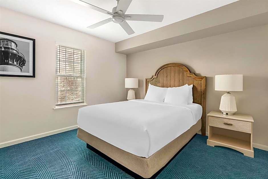 This suite features a plush king sized bed in master bedroom and a loft area with two twin beds. Enjoy a fully-equipped kitchen that provides all of comforts of a home and the convenience to make a meal. The entire family can enjoy this beautiful suite offering a separate living room with a 42’’ HD TV and DVD player. Suite also has a furnished patio. Can accommodate up to 6 guests.